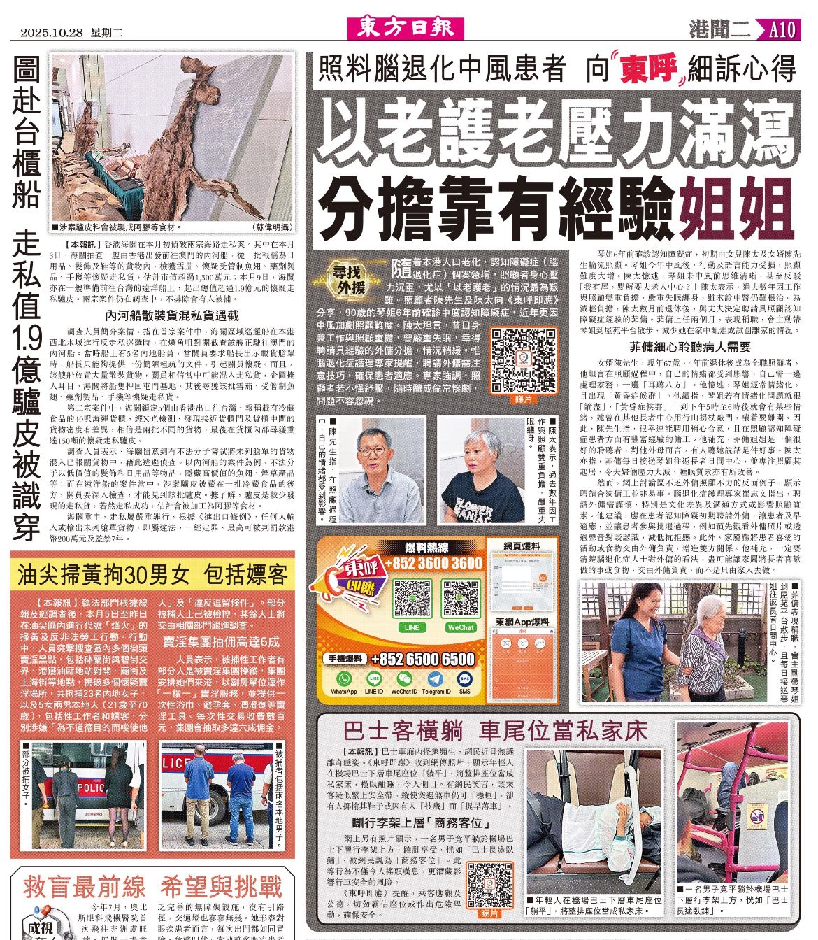 | 28/10/2025 | 東方日報 | 照料腦退化中風患者 向東呼細訴心得 以老護老壓力滿瀉 分擔靠有經驗姐姐
